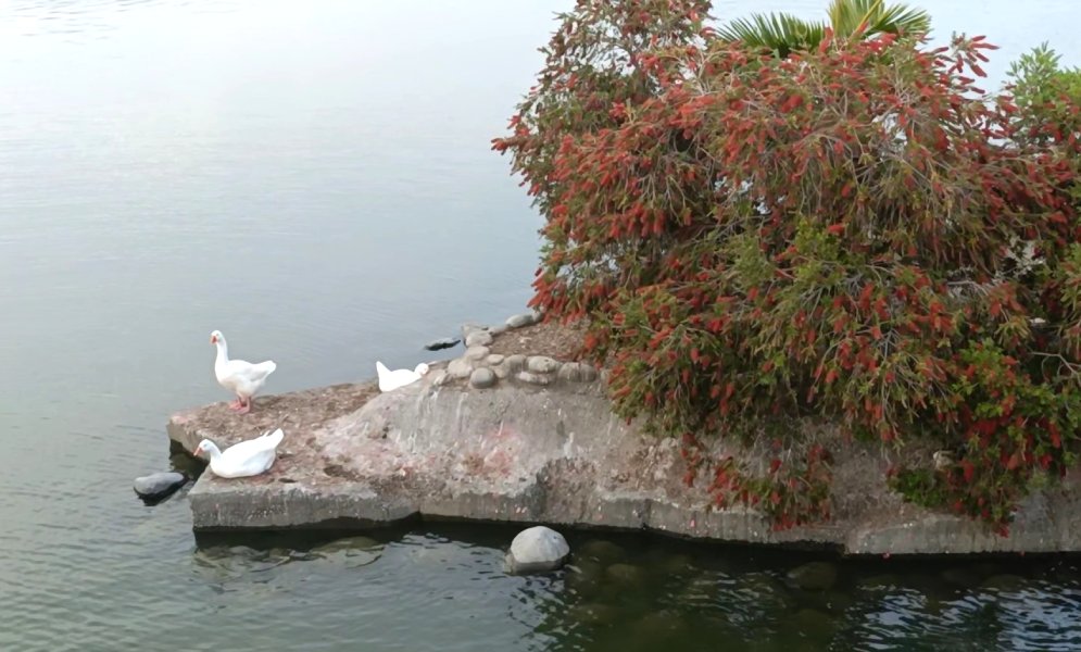 พวกเราใช้เวลาอยู่ที่พิพิธภัณฑ์ซักพักจนฝนเริ่มซา เดินผ่านสุมทุมพุ่มไม้ออกมาที่บึงบัว ฟ้ามีเมฆมากไม่ค่อยร้อนเท่าไหร่ เป็ดแมนดารินหัวเขียวว่ายน้ำไปมา แต่ที่น่าสนใจยิ่งกว่าคือคนที่เล่น Wake Board อยู่ในบึง โซน Wake Board กินบริเวณกว้าง ดูน่าสนุกมากๆ แม้ว่าบึงแห่งนี้จะขึ้นชื่อเรื่องวัดและศาลเจ้า แต่ก็เป็นที่พักผ่อนหย่อนใจ ทำกิจกรรม ของชาวเมืองอีกด้วย
